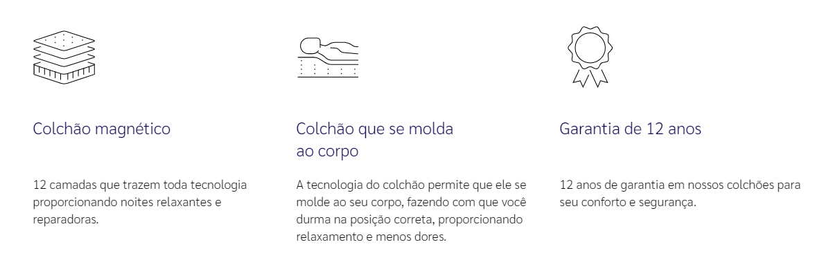 Colchão ortopédico, sistema multicamadas, 2500 pastilhas de magnético, tecido de fibra de bambu ocre (absorve a umidade, sem reter, e também proporciona toque macio e aveludado), colchão que se molda ao corpo do usuário, vibromassagem com mais de 20 tipos de massagem (opcional), cromoterapia, energia quântica, infravermelho, partículas de turmalina (responsável pela reposição de vitamina D) e laterais em tecido sued.