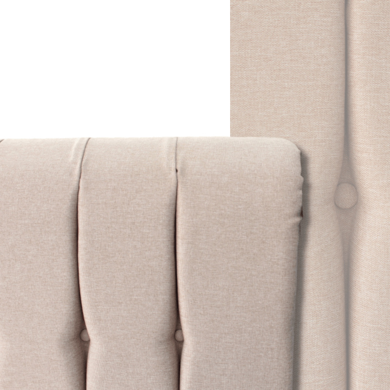 Cabeceira estofada em gomos retangulares divididos na vertical. O espaço entre os gomos possui um detalhe de botão encapado.
