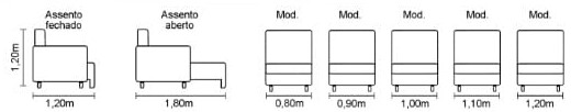 - Percintas italianas, duplo molejo, fibra siliconada nos encostos e braços, madeira em eucalipto tratado, braços que acompanham o módulo, densidade 28.